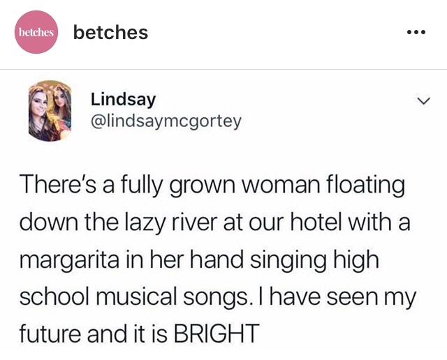 … Reign in my drinking??? HA ha! I kid. I DEFINITELY don’t drink like I used to. You hit an age where you may not want to be that grown adult woman floating down the lazy river singing high school musical…. Okay. Who am I kidding. I WOULD TOTALLY BE THAT WOMAN! Except, I would do that sober! π